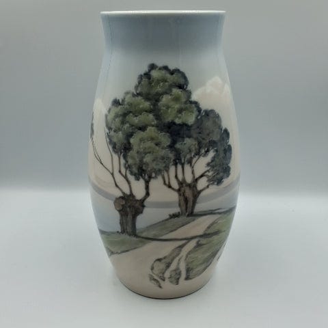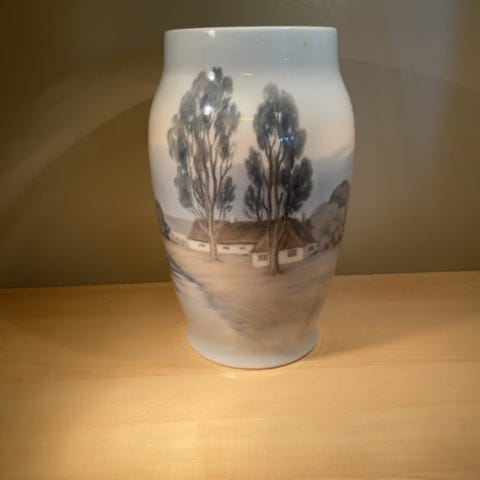 Vasen har en glat overflade med maleriske motiver af træer og huse. Den er lavet af porcelæn. Den er nummereret 6682/2 MH ,Afhentes i:,Røde Kors Sorø (335),Bemærk at mail, chat og beskeder ikke besvares, og varen skal købes på knappen "Gå til varen"