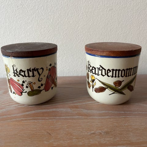 Behållere i keramik med farverigt, håndmalet mønster og trækonstruktion som låg.,Afhentes i:,Røde Kors Horsens (615),Bemærk at mail, chat og beskeder ikke besvares, og varen skal købes på knappen "Gå til varen"