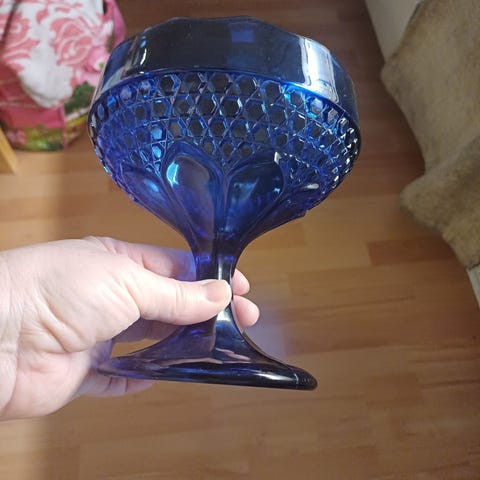 Skålen er lavet af klart glas med et smukt mønster og har en metalhank.,Afhentes i:,Røde Kors Sorø (335),Bemærk at mail, chat og beskeder ikke besvares, og varen skal købes på knappen "Gå til varen"