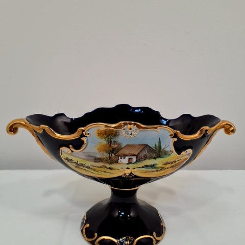 Alcobaca blå porcelæns bordskål / frugtskål. Made in Portugal. Skålen har et fint, hulmønstret design med en underdel dekoreret med landskab. Den er lavet af keramik med gulddetaljer. ,Afhentes i:,Røde Kors Bellinge (461),Bemærk at mail, chat og beskeder ikke besvares, og varen skal købes på knappen "Gå til varen"