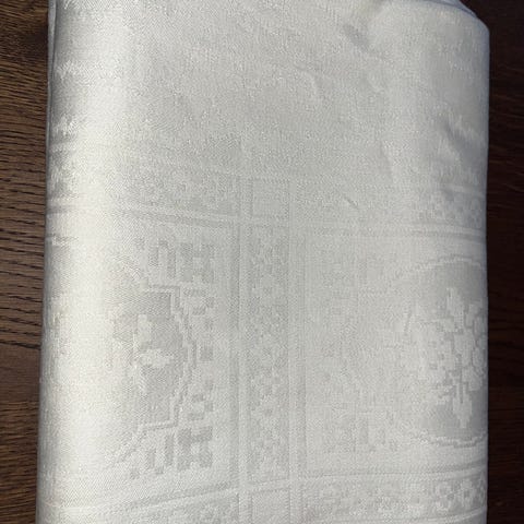 Igen en af Georg Jensens duge, størrelse er 140 x 160. Dugen er hvid på forsiden og beige på bagsiden. Dette gør at der kommer et mønster frem der ligner en sol/Blomst ,Afhentes i:,Røde Kors Aabenraa (546),Bemærk at mail, chat og beskeder ikke besvares, og varen skal købes på knappen "Gå til varen"