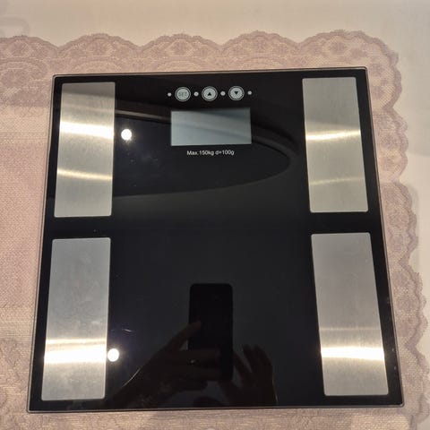 Vægten har et fladt design med en glasoverflade og metalstænger til vægtmåling. Helt ny og ubrugt, stadig i indpakning. ,Afhentes i:,Røde Kors Holstebro (661),Bemærk at mail, chat og beskeder ikke besvares, og varen skal købes på knappen "Gå til varen"