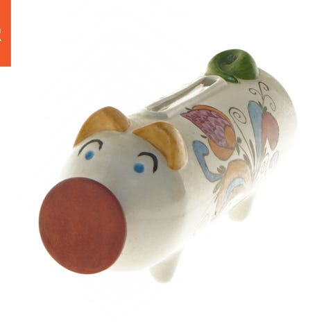 Udformet som en gris, denne sparegris er dekoreret med farverige blomster og blade. Den er lavet af keramik.,Afhentes i:,Røde Kors Horsens (615),Bemærk at mail, chat og beskeder ikke besvares, og varen skal købes på knappen "Gå til varen"