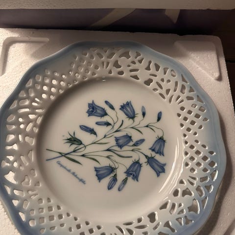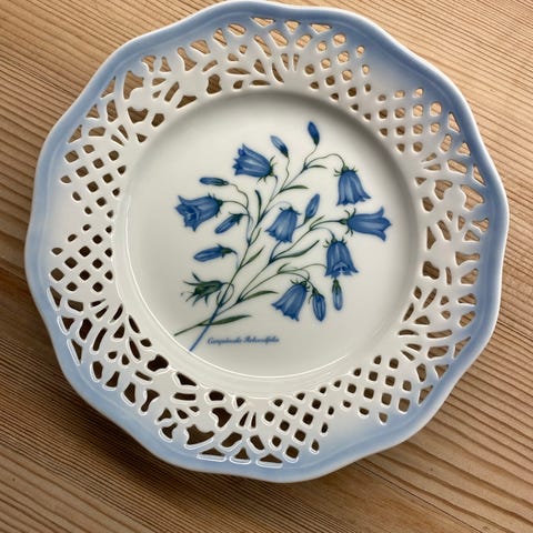 Platten har et elegant, blomstermotiveret design og en udsmykket kant.,Bemærk at mail, chat og beskeder ikke besvares, og varen skal købes på knappen "Gå til varen"