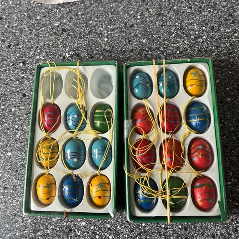 Produkterne er dekorerede æg i forskellige farver med blomsterdesign. De har et glat overflade og er lavet af let materiale. Hver har et bånd til ophæng. 6 stk i en æske. Kan have brugsspor.,Afhentes i:,Røde Kors Aabenraa (546),Bemærk at mail, chat og beskeder ikke besvares, og varen skal købes på knappen "Gå til varen"