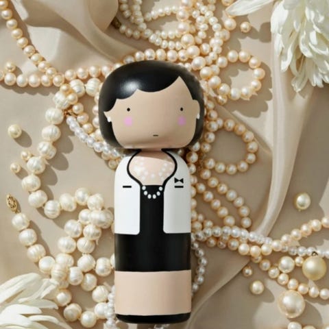 Produktet er en dekorativ figur med et karakteristisk ansigt og en farverig krop. Den øverste del er hvid med små sorte og rosa detaljer, mens kroppen har et pink lag med sorte cirkler og en sort bund. Materialet ser ud til at være plast eller træ, hvilket giver en solid finish.,Afhentes i:,Røde Kors Tuborgvej / København NV (101),Bemærk at mail, chat og beskeder ikke besvares, og varen skal købes på knappen "Gå til varen"