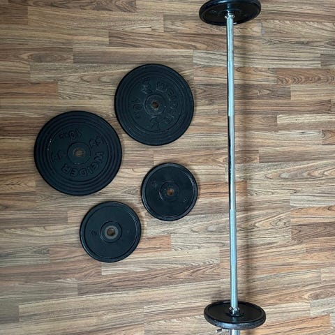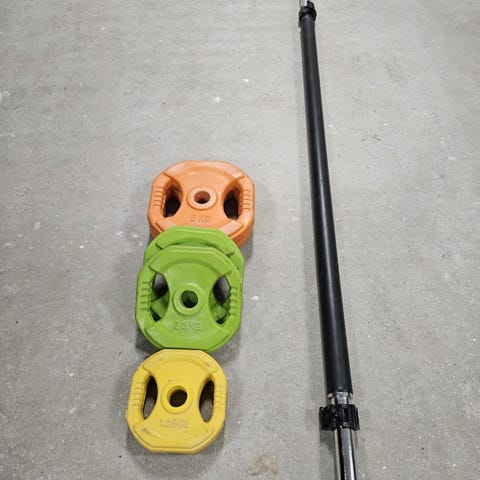 vægtstang sæt 40 kg. Sættet inkluderer vægtskiver i forskellige mål. 2x1,25 kg, 2x2,5 kg, 2x5 kg, 2x10 kg + 2,5 kg stang og clips.
