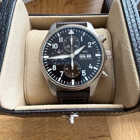 Til salg er her et IWC Pilot Chronograph med flot sunburst skive og sort rem.