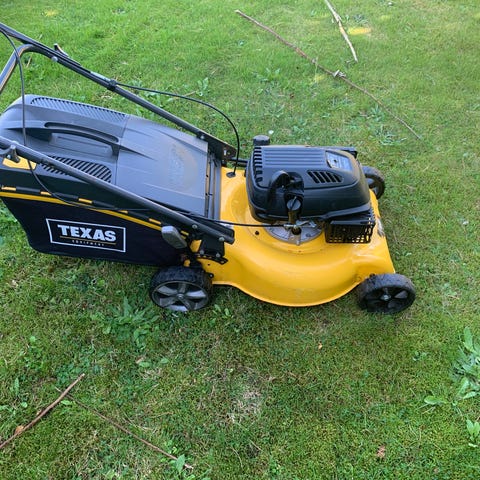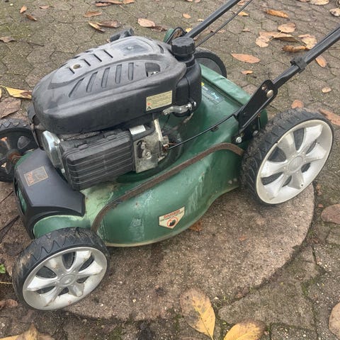 Nyserviceret og velfungerende benzin klipper med bagudkast, træk på baghjulene og en klippebredde på 51cm.