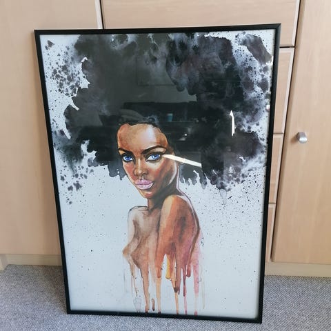Kunstplakat med abstrakt motiv af en kvinde. Plakaten er indrammet i en sort ramme og har en farverig komposition med gule, røde og blå nuancer. Velegnet til dekoration i hjemmet.