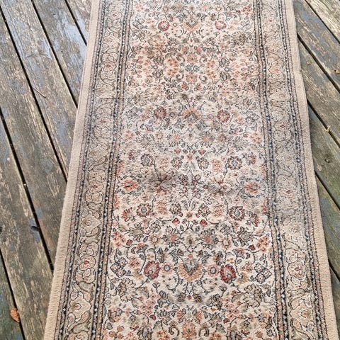 Langt tæppe med blomstermønster.