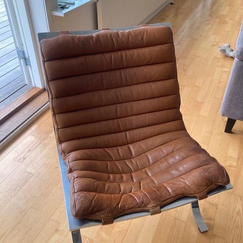 Arne Norell Inka lænestol. Original betrukket med patineret læder. Fremstillet hos Norell. H. 90/40 B. 89 D. 100 cm.