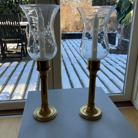 2 stk gamle messing lysestager med glaskupler