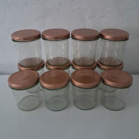 - 10 stk. tomme klassiske runde syltetøj/honning glas, 450g / 420 ml med plastik låg. De 9 har gyldent låg, mens 1 har hvidt låg.