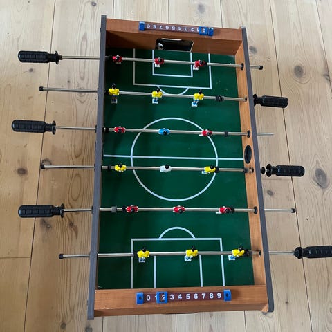 Bordfodboldspil i træ med en rød og hvid farvekombination. Spillet har robuste metalstænger og figurer i gule og røde dragter. Perfekt til underholdning i hjemmet eller på kontoret.