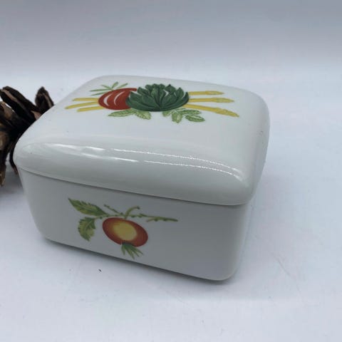 smørboks fra Lyngby Porcelæns stel "Danild 50 Frugt og Grønt", også kendt som "Picnic stellet".