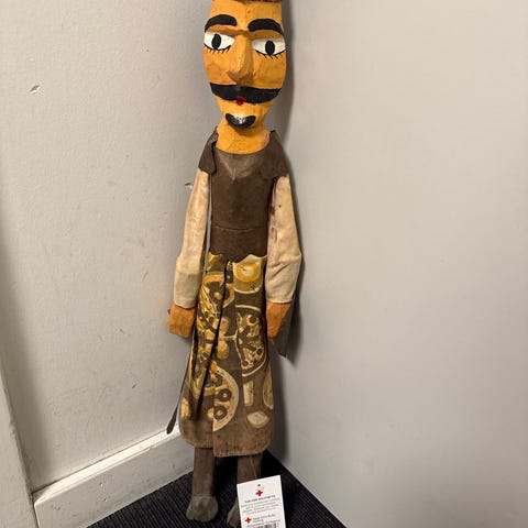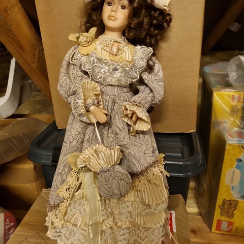 Harlekindukke med porcelænshoved, tøj i blå-grøn farve. Højde 65 cm,Afhentes i:,Røde Kors Bellinge (461),Bemærk at mail, chat og beskeder ikke besvares, og varen skal købes på knappen "Gå til varen"