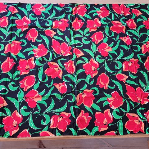 Indisk bomuld, sort med råhvidt mønster. Voksbatik. Dejligt let stof. Den ægte vare – var med i rygsækken i 1886. 95cm bred x 290cm. Vejer 305g.
