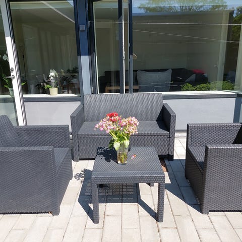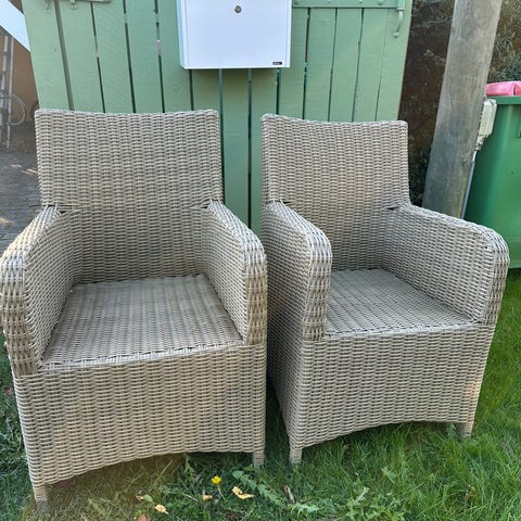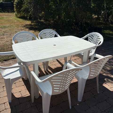 Havemøbler til terrasse Der er seks styks som vises på billedet med høner og sidematerialet er af plastik og under stellet af tre