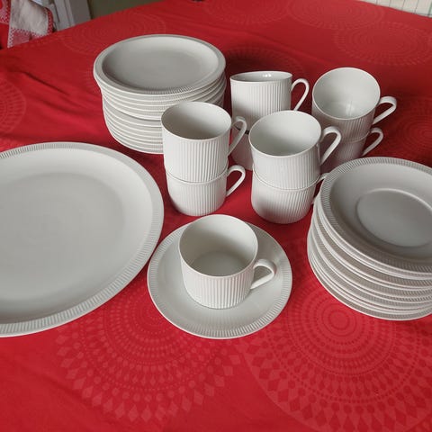 Sættet inkluderer 6 tallerkener, kopper og underkopper. Klassisk design med holdbart materiale.