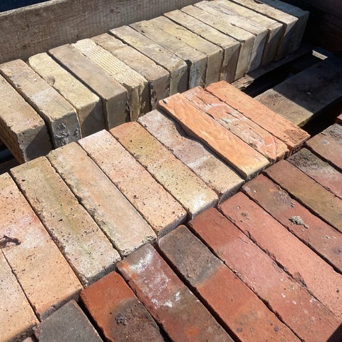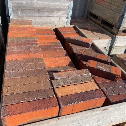 450 gule cellemursten med præg. 4 kr pr stk med mørtel der let går af. 8 kr pr stk renset. Kan læsses med truck.