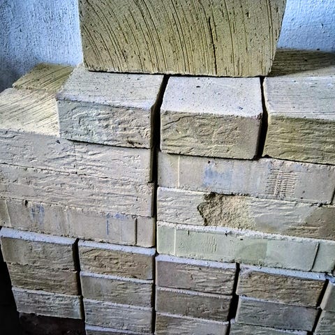 550 gule cellemursten med præg. 4 kr pr stk med mørtel der let går af. 7 kr pr stk renset. Kan læsses med truck.
