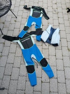 2 våddragter i blå farve, fremstillet af neopren samt en redningsvest 30-40 kg. Våddragterne er designet til vandaktiviteter og tilbyder komfort og fleksibilitet. Størrelse 8/9 år, passer til både en pige og en dreng. Perfekt til surfing, svømning eller anden vandsport. Sælges samlet eller hver for sig. Samlet pris 200 kr. Prisen per våddragt