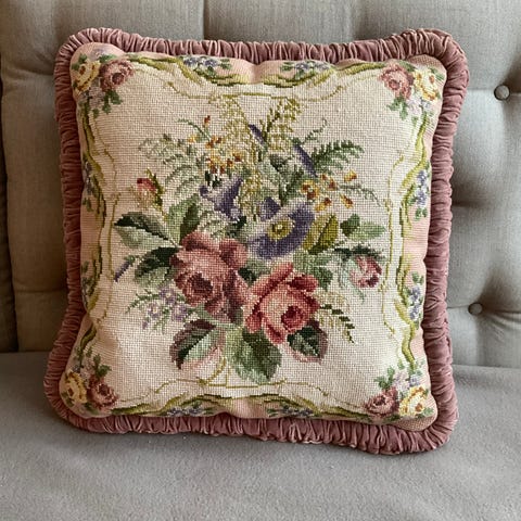 Vintage broderet pude. Håndarbejde. Håndlavet pude. broderet pyntepude. Pude broderet med fladsting. Pyntepude med broderi. Sofapude med fladsting. Sofapude med broderi. Sofapude med broderi. firkatet pude. Broderet pudebetræk. Pude broderi. Fladsting. Fladtetrådssting. Håndbroderet fladsting. Vintage pyntepude. Brun pude. Håndlavet aflang broderet pude.. pude med broderi. Pudebetræk med broderi