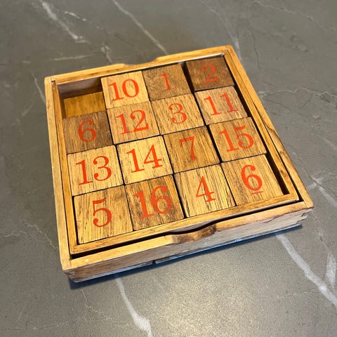 Spil, Træspil “De Tossede Terninger”. Et puslespil med 4 terninger, som skal arrangeres, således at een af hver farve bliver vist på alle 4 sider. Ud af 365 mulige kombinationer er der kun een, der er rigtig. Løsningsvejledning medfølger.