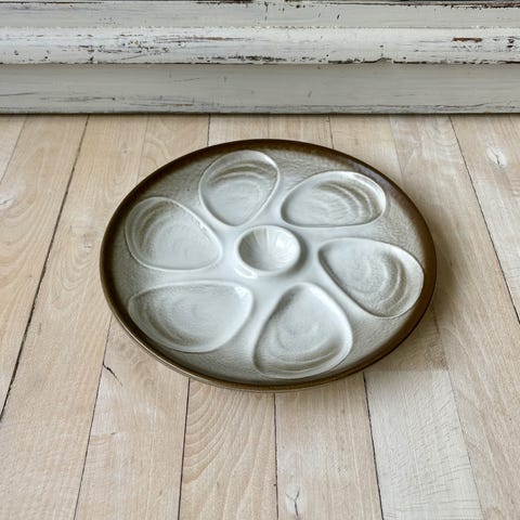 Smukke Vallauris østerstallerkener med den smukkeste glasering i brune, orange og gule nuancer til servering af østers. Hver tallerken har plads til et halvt dusin østers og en fordybning til citron eller vinaigrette.