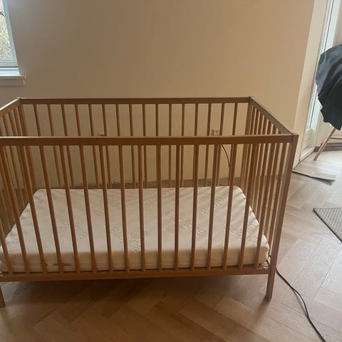 Rigtig fin tremmeseng. Har fået brugsspor (se billeder). Kan indstilles i to højder og kam bruges som bedside crib eller lille sofa til børn. Ny pris 2.499kr uden madras. Madras have og gives med gratis hvis køber ønsker.
