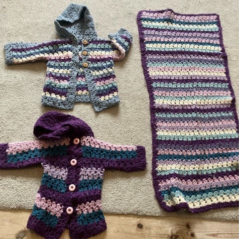 Babytæppe, Hjemmehæklet, Blødt uldtæppe og cardigans i smukke farver. Kan også bruges i Barnevogn og klapvogn. 150 kr pr stk