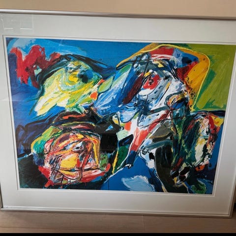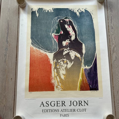 Asger Jorn Copyright 1989 Yves Riviere kunsttryk med. Højde 1,43 m x bredde 1,18 m. Med forsølvet egetræsramme.