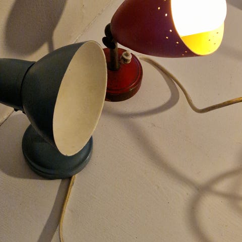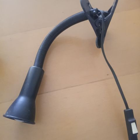 Et par skønne clipslamper med en længde på 58 cm. Renoverede med nye ledninger med afbryder. Længde 1,5 m fra fastgørelsen på stangen. De har en god patina med buler og brugsspor. De sælges som et par til samlet pris - sender gerne - Fast pris