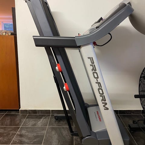 Det er en stor maskine. Selve løbebåndets længde er 152 cm og bredde 55 cm, så meget behageligt og trygt at løbe på det. Hele maskinens bredde er 93 cm.