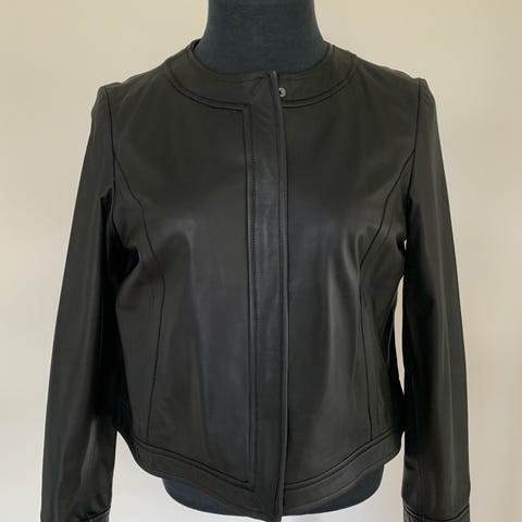 Jakke fra Jaeger, et engelsk high end brand, i "biker look a like" udformning, i sort med læderbesætning og i størrelse 44, brystmålet er cirka 106 cm medens længden er cirka 53 cm.