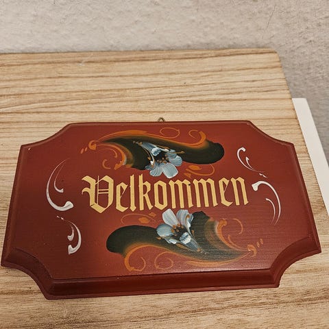 Charmerende skilt med teksten Velkommen. I træ. Håndmalet. Se billeder for mål. Sender gerne.