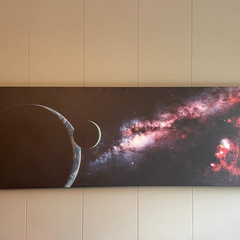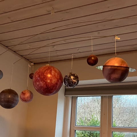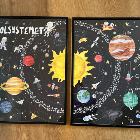Det består af en plakat med solsystemet. Den måler 25x60 cm, samt et ark med selvlysende stjerner, man kan klistre på plakaten.