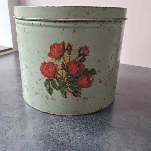 Vintage småkageopbevaring i træ.
