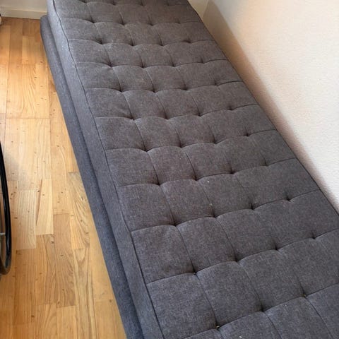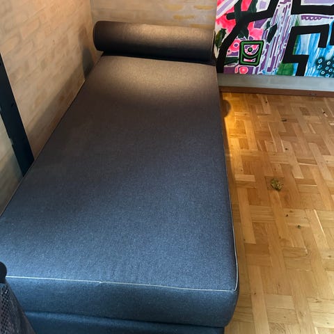 Sælges en Ilva daybed / sovesofa. Madras 85x200 cm. Én af knapperne sidder løs, men kan sikkert syes fast igen. Én af lamellerne er knækket. 2 store puder følger med. Den har stået i et sommerhus og har været brugt begrænset. Skal afhentes i Hundested.