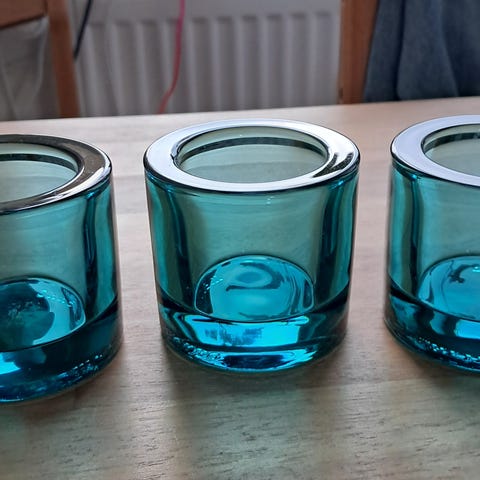 Tre blå Marimekko fyrfadsstager i glas.