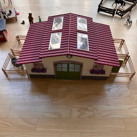Schleich telt med meget udstyr. Telt, sovepose, bamse, trækvogn, mini spring, æbler, ejern, store heste, føl og en pige dukke. Det hele er i rigtig god stand.☺️
