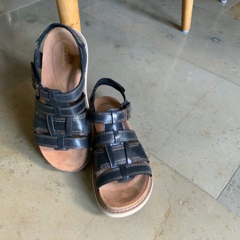 Clarks sandaler sort læder, størrelse 41. 7,5 - 8, Skoene er designet med en elegant hæl og en justerbar rem for optimal pasform. Ideelle til både formelle og afslappede lejligheder.