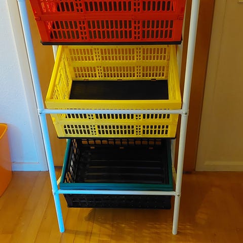 Stativet er helt nyt – jeg har kun åbnet det og konstateret, at det ikke passer til mine mål. Det virker meget stabilt, og man kan justere afstanden mellem metal-separatorerne. Der sidder stadig dobbeltklæbende tape under, så det kan fastgøres direkte, og der medfølger også skruer (kan ses på billedet).