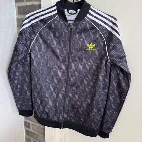 Den har gennemgående lynlås samt hætte. Den har et hvidt Adidas logo øverst foran i venstre side.derudpver har den en stor dobbelt lomme foran