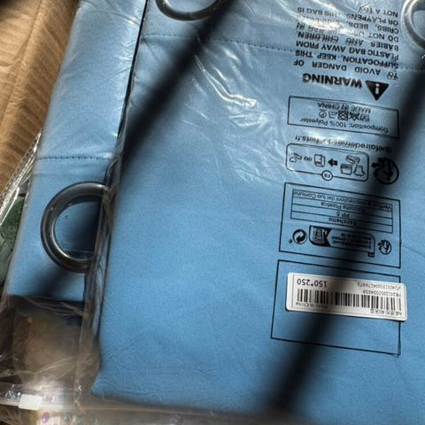Cremefarvede gardiner med rynkebånd. Har været i brug i meget kort tid. De er faktisk meget flotte men jeg kan ikke give et bedre billede fordi de er så store at håndtere.