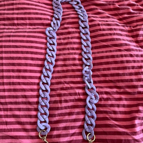 Lyserød/pink taskerem, måler ca. 120 cm. Afhentning foretrækkes. Sælges for 15 kr. Betaling via MobilePay.
