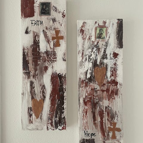 Abstrakte malerier - 2 stykker. Disse kunstværker er udført på lærred med en kombination af farver, der inkluderer brun, hvid, sort og rød. De abstrakte designs tilføjer et moderne touch til ethvert rum. Velegnet til ophæng i stue eller kontor.