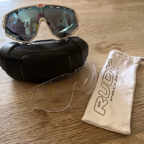 Ret fed brille med røde glas. Egentlig købt til løb, men det er der vist ingen kategori til. Jeg har løbet med dem to eller tre gange, og det er bare ikke mig. Først til mølle
