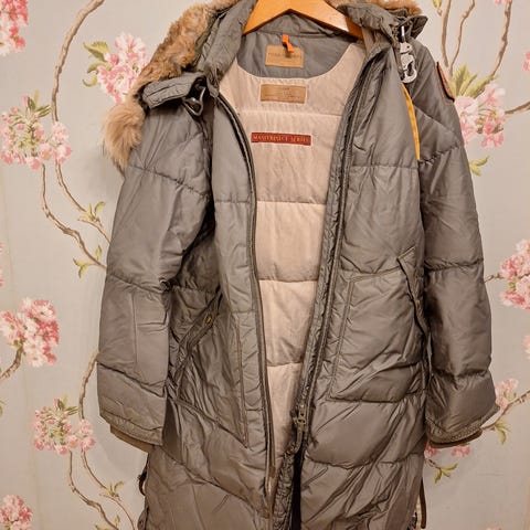 Parajumpers vinterfrakke til kvinder mørkebrun , meget flot. Og varm. Med mange detaljer og lommer med hætte med ægte pels. Sælges billigt. Størrelse small .
